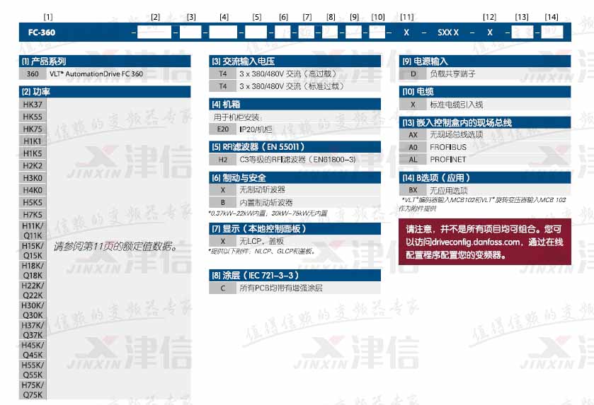 如FC360H1K5T4E20H2BXCDXXSXXXXALBX,代表380V,1.5KW,IP20,C3等級(jí)內(nèi)置濾波器,內(nèi)置制動(dòng),PROFINET現(xiàn)場總線
