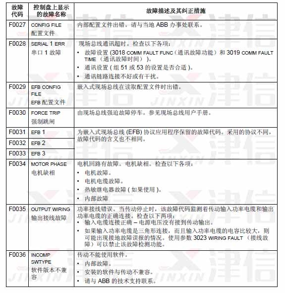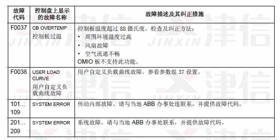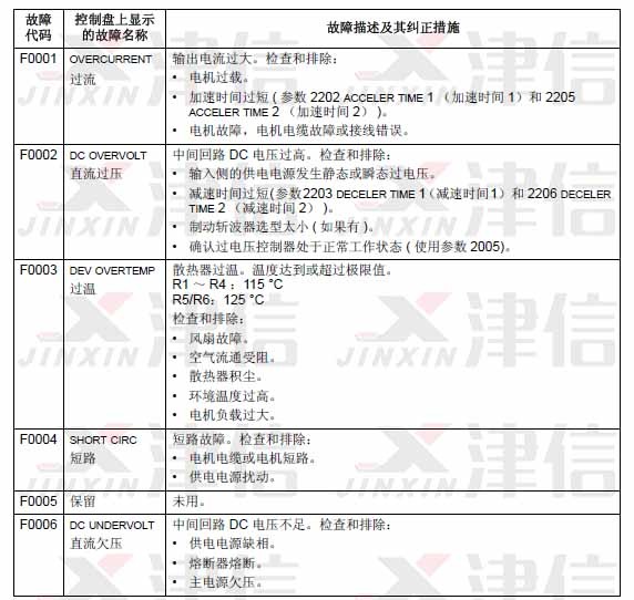 可以通過(guò)MENU/ENTER鍵來(lái)清除故障信息。如果故障依然存在,故障信息會(huì)在幾秒鐘后再次出現(xiàn)。此時(shí)需要根據(jù)故障代碼來(lái)進(jìn)行相應(yīng)的檢查和采取應(yīng)對(duì)措施。