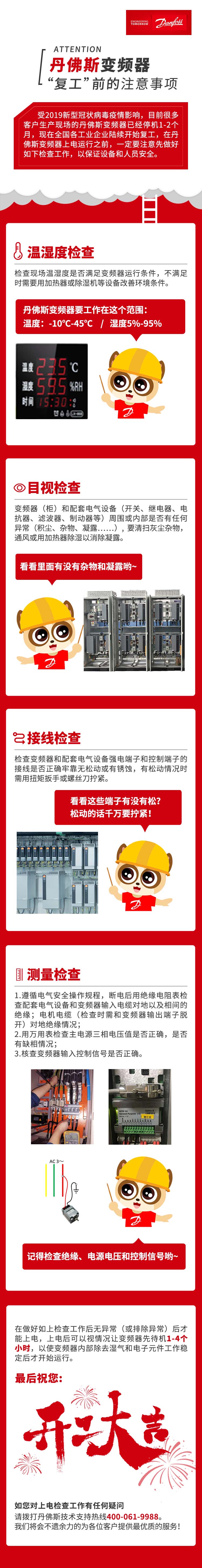 丹佛斯變頻器復(fù)工前請做好相應(yīng)的溫濕度檢查,測量檢查,目視檢查和接線檢查。