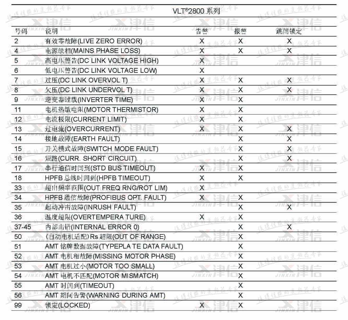 丹佛斯VLT2800系列變頻器故障代碼和報(bào)警信息如下: