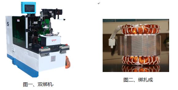 雙綁機(jī)用于綁扎電機(jī)定子線圈,主要?jiǎng)幼饔卸ㄗ予F芯分度,針桿進(jìn)退、上下和角度控制,自動(dòng)剪切線等,設(shè)有綁線張力調(diào)節(jié)器,可調(diào)節(jié)綁線的松緊。整機(jī)如圖一所示,綁扎效果如圖二。