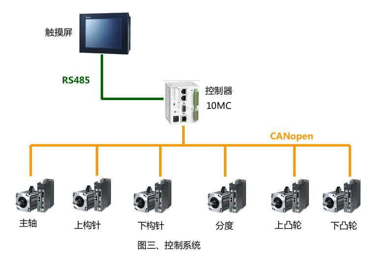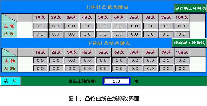 10MC總線運(yùn)動(dòng)控制器控制主軸運(yùn)行,主軸帶動(dòng)機(jī)械凸輪控制鉤針的前后運(yùn)動(dòng),同時(shí)主軸又作為鉤針、上下電子凸輪的主軸信號(hào),控制鉤針?biāo)欧?、上下凸輪伺服根?jù)預(yù)設(shè)的凸輪數(shù)據(jù)運(yùn)動(dòng)。