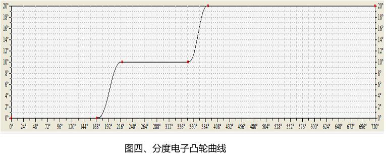 設(shè)備通過(guò)分度伺服跟隨主軸執(zhí)行預(yù)先設(shè)定的電子凸輪數(shù)據(jù),從而達(dá)到對(duì)定子的分度控制。分度電子凸輪曲線如圖四所示。