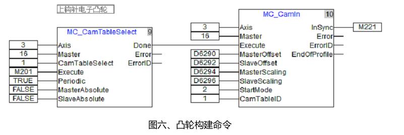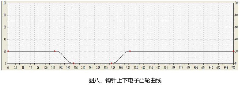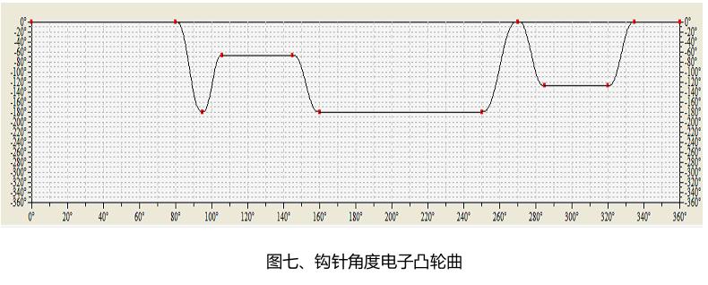 首先構(gòu)建好凸輪曲線,使用“MC_CamTableSelect”指令選擇對(duì)應(yīng)的凸輪曲線;再通過(guò)“MC_Camin”指令使得主軸與從軸按照選定的凸輪曲線嚙合(如圖六所示)。構(gòu)建完成的鉤針角度電子凸輪曲線如圖七所示,構(gòu)建完成的鉤針上下電子凸輪曲線如圖八所示,