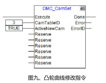 在實(shí)際使用中,因客戶產(chǎn)品的多樣性,不同的馬達(dá)定子,客戶需要隨時(shí)修改電子凸輪曲線,通過(guò)10MC運(yùn)動(dòng)控制器的“DMC_CamSet”指令可以在線實(shí)時(shí)修改電子凸輪曲線,提高了設(shè)備的通用性。凸輪曲線修改指令如圖九所示,在線修改凸輪曲線界面如圖十所示。