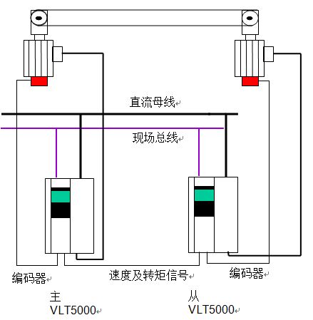 變頻器由共用直流母線供電, 丹佛斯可提供整流/回饋裝置或由用戶提供. 各分部速度可由現(xiàn)場總線提供, 也可由變頻器本身形成速度鏈. 變頻器采用速度閉環(huán)控制. 從變頻器的速度參考值由主變頻器給定. 同時(shí)主變頻器提供給從變頻器轉(zhuǎn)矩信號. 從變頻器根據(jù)其轉(zhuǎn)矩與主變頻器的差別, 動態(tài)修正從變頻器的轉(zhuǎn)速, 從而保證兩個(gè)變頻器出力一致. 所有運(yùn)算通過可自由編程的工藝控制卡實(shí)現(xiàn).