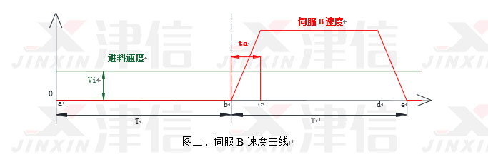 新型鋪網(wǎng)機(jī)的工作原理見圖一,其中伺服A為下跑車的驅(qū)動(dòng)伺服,決定了下跑車的運(yùn)行速度;下跑車就是鋪網(wǎng)頭,下跑車的速度就是鋪網(wǎng)機(jī)的鋪網(wǎng)速度。伺服B驅(qū)動(dòng)前碳簾運(yùn)行,前碳簾a段速度是鋪網(wǎng)機(jī)的原料輸入速度,要與前端設(shè)備速度同步。伺服C驅(qū)動(dòng)上跑車運(yùn)行。伺服D驅(qū)動(dòng)后碳簾運(yùn)行。伺服E驅(qū)動(dòng)底簾運(yùn)行。前碳簾在下跑車出口處的速度就是原料的出口速度。如果要求均勻鋪網(wǎng),則出料速度必須等于下跑車速度的絕對(duì)值;另外要求原料輸入速度要等于Vi,保持恒定不變。根據(jù)上述兩條基本運(yùn)動(dòng)約束條件,可以分別推算出各臺(tái)伺服在鋪網(wǎng)時(shí)的運(yùn)行速度特征曲線。