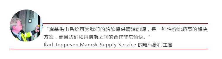 2017年初,Maersk Supply Service公司的電氣部門主管Karl Jeppesen針對公司管理提出了一個商業(yè)案例,即使用岸電為船舶供電,預(yù)計在6個月內(nèi)實現(xiàn)投資回報。很快,公司就通過了這個岸電項目,而且到2017年10月時整套系統(tǒng)就已完全投入運行。