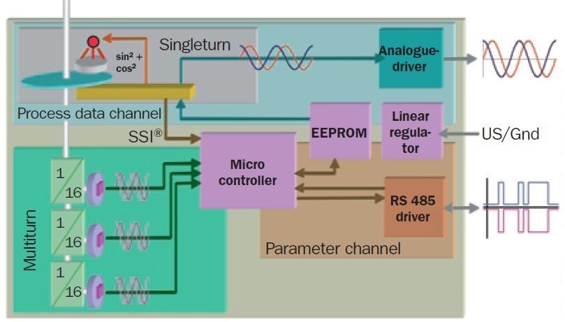 HIPERFACE編碼器是一種串行絕對位置和正余弦模擬量信號混合編碼器,內(nèi)部原理框圖見圖1。