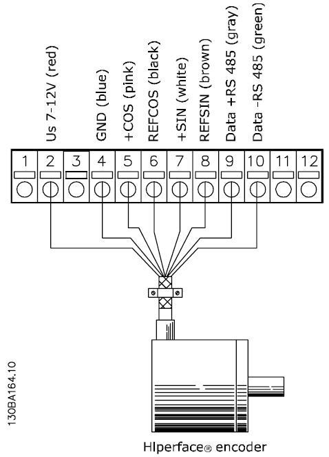 丹佛斯編碼器選件卡MCB102支持長線驅(qū)動增量形編碼器、EnDat絕對位置編碼器、SSI絕對位置編碼器和HIPERFACE接口編碼器。當(dāng)接HIPERFACE接口編碼器時(shí),接線圖如圖2所示。