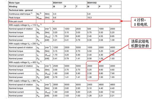 380V驅(qū)動器內(nèi)部直流電壓約530V,考慮20%欲量,應(yīng)選擇400Vdc選此組電機(jī)額定參數(shù),因此得到電機(jī)額定電流2.30A、額定轉(zhuǎn)速2000rpm、額定轉(zhuǎn)矩5.20Nm和電機(jī)極數(shù)8極。