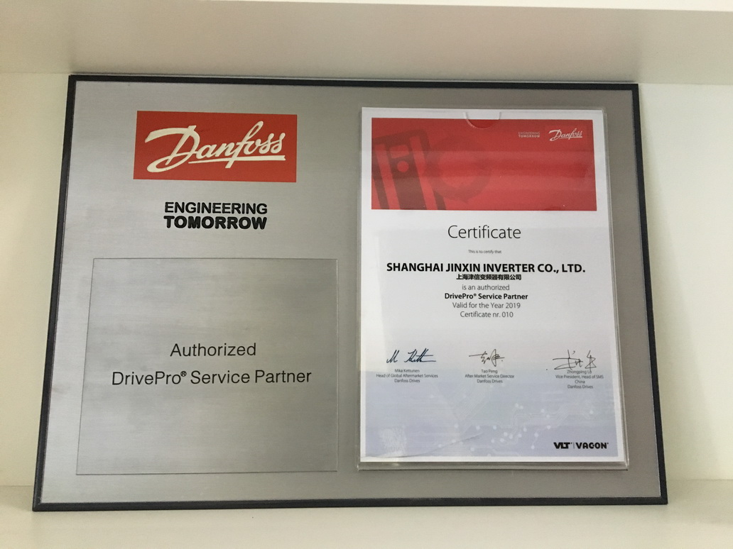 2018年12月11日, 丹佛斯中國(guó)區(qū)服務(wù)總監(jiān)彭濤先生和服務(wù)經(jīng)理毛申麟先生向上海津信變頻器有限公司頒發(fā)了丹佛斯授權(quán)“DrivePro®”服務(wù)商的授權(quán)證書。上海津信成為全球第十家,中國(guó)華東和華南地區(qū)丹佛斯授權(quán)“DrivePro®”服務(wù)商。